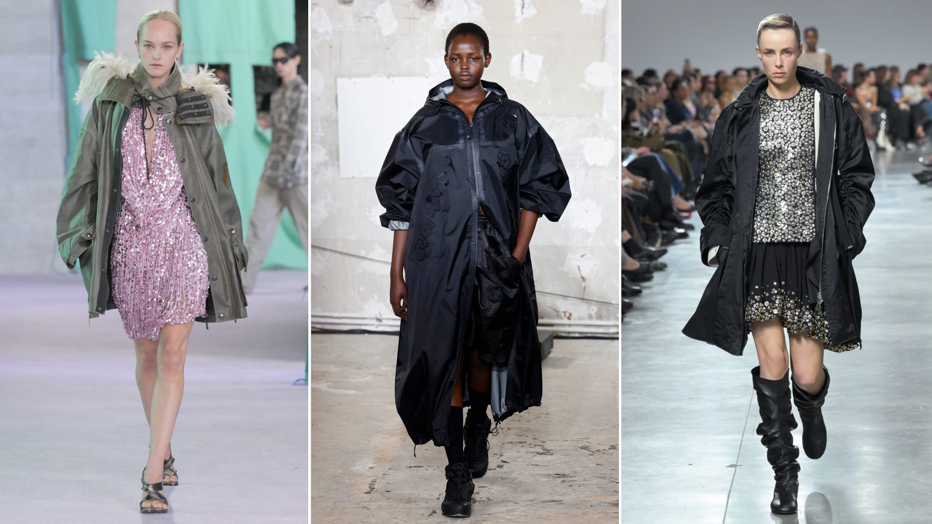 Harper’s Bazaar’s spring jacket forecast reached a similar conclusion, calling sporty shells spring’s answer to heavy winter wool and pointing readers toward Loewe-inspired bright versions and lighter technical layers. Town & Country’s spring report likewise framed technical jackets as one of the season’s biggest topper stories, with funnel necks, stand collars, cropped cuts and drawstring waists giving the silhouette shape and polish.